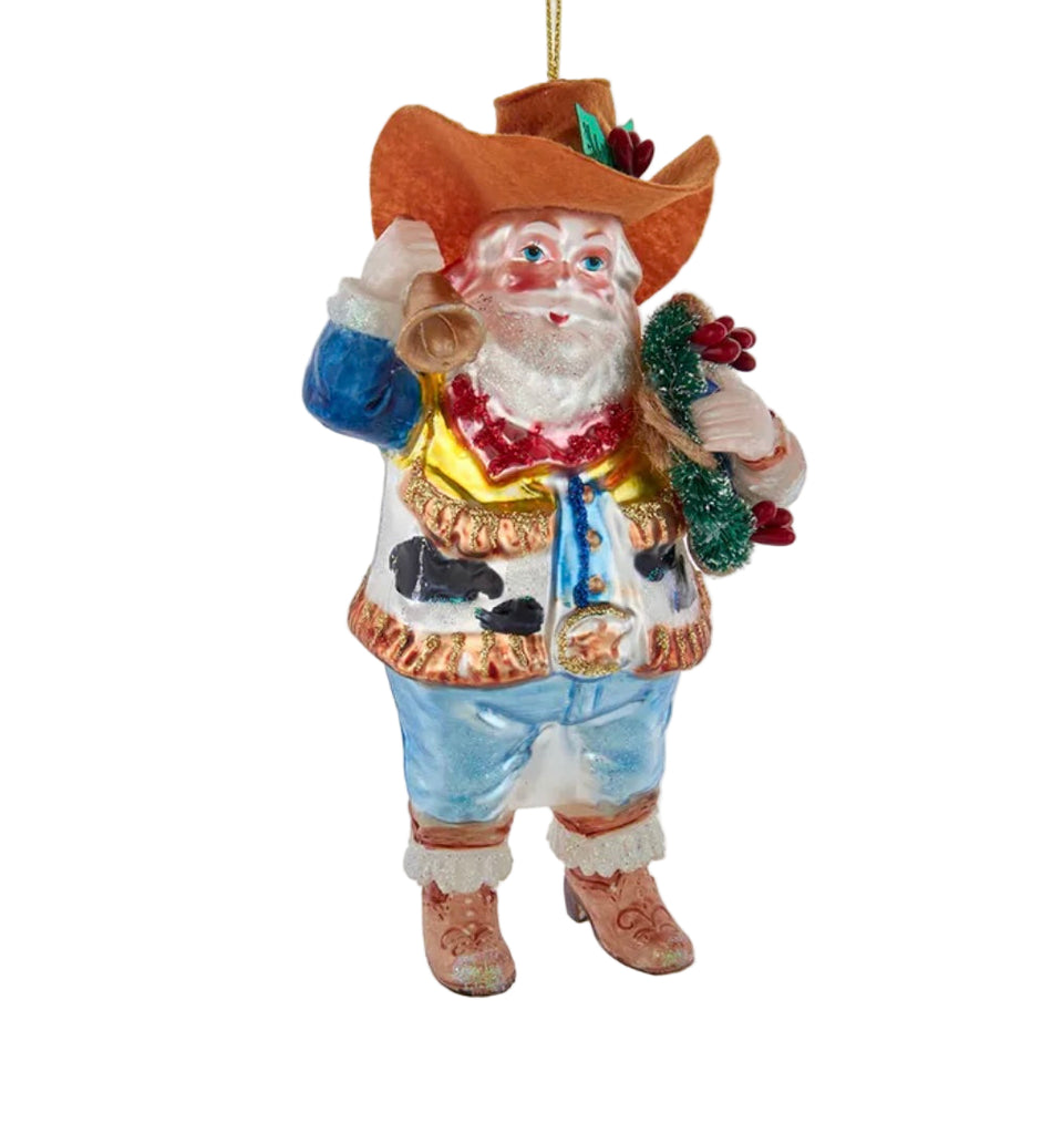 This glass cowboy Santa ornament is a festive addition to any holiday décor or Christmas tree. It features Santa dressed in his cowboy best with a cowboy hat!
