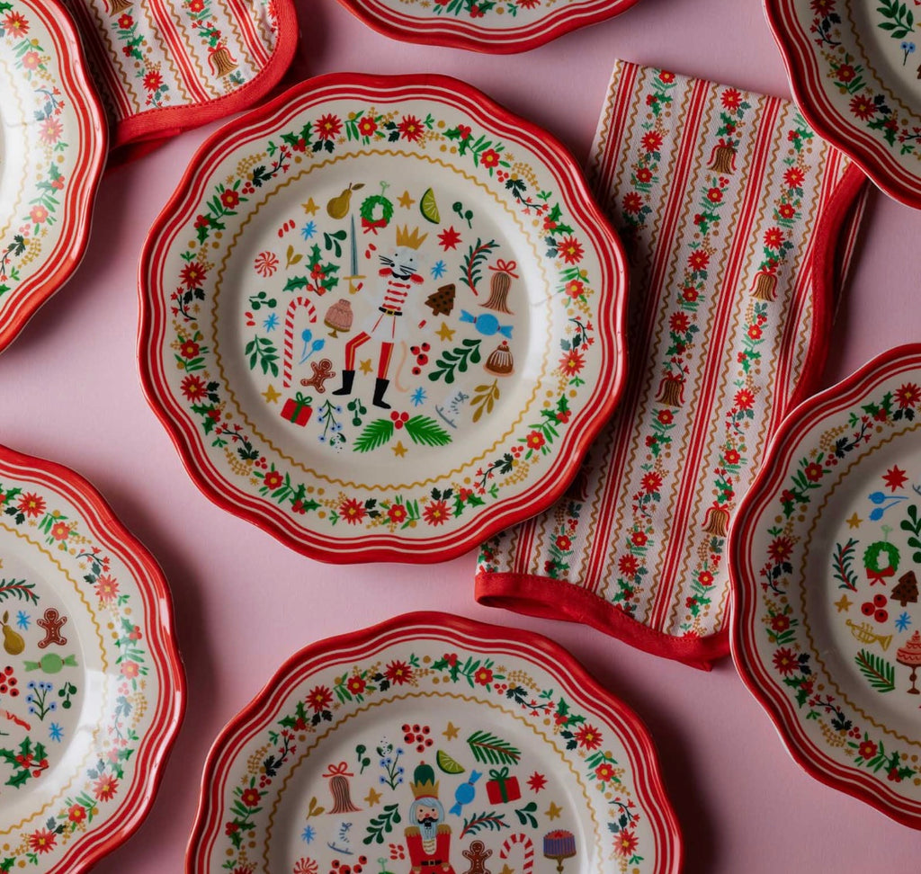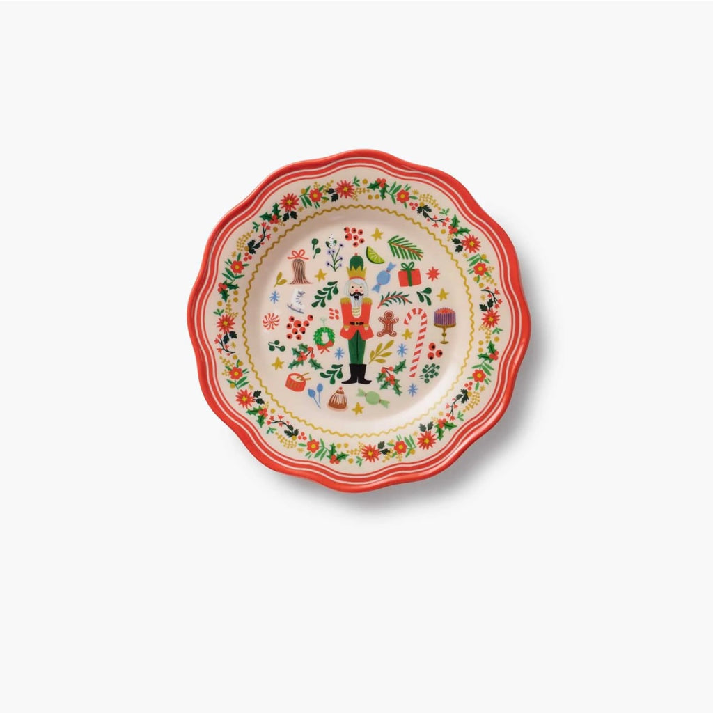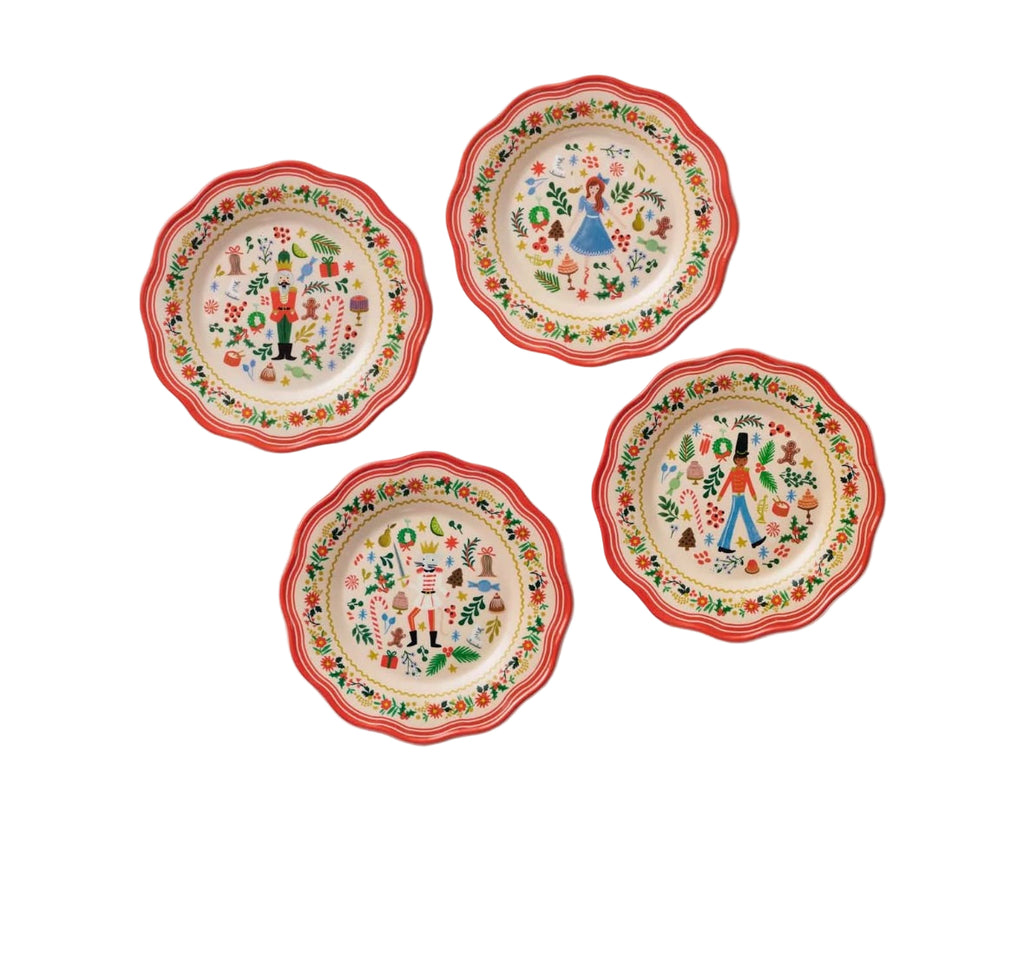 These melamine, Nutcracker-inspired dessert plates features a scalloped edge and illustrated characters from the famous ballet. Lightweight and durable yet elevated, our melamine serveware collection is perfect for indoor or outdoor entertaining alike.