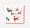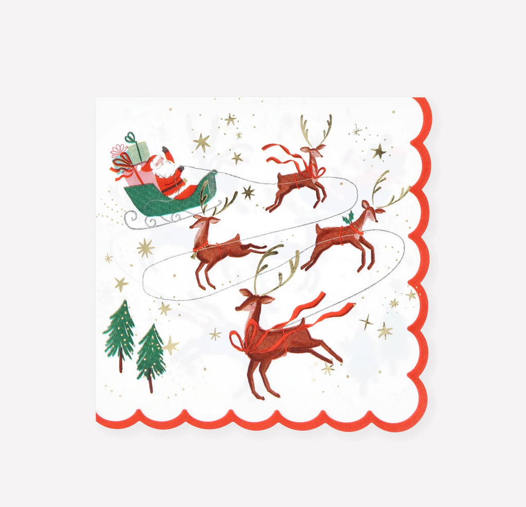 Ho, ho, ho! Santa's making his grand entrance in style, with his sleigh brimming with gifts and his reindeer leading the way. These premium large napkins are your shortcut to a merry and magical Christmas. With a sophisticated scalloped edge, and a vibrant red border, they'll bring an elegant touch to your party table!