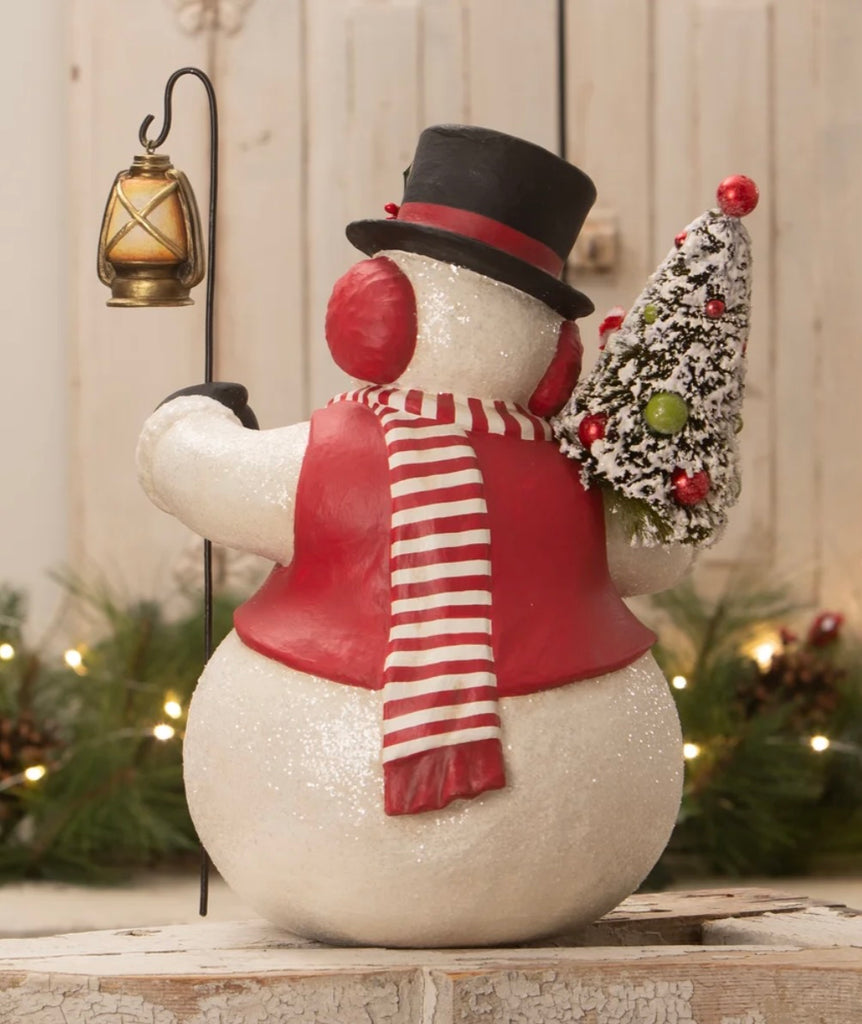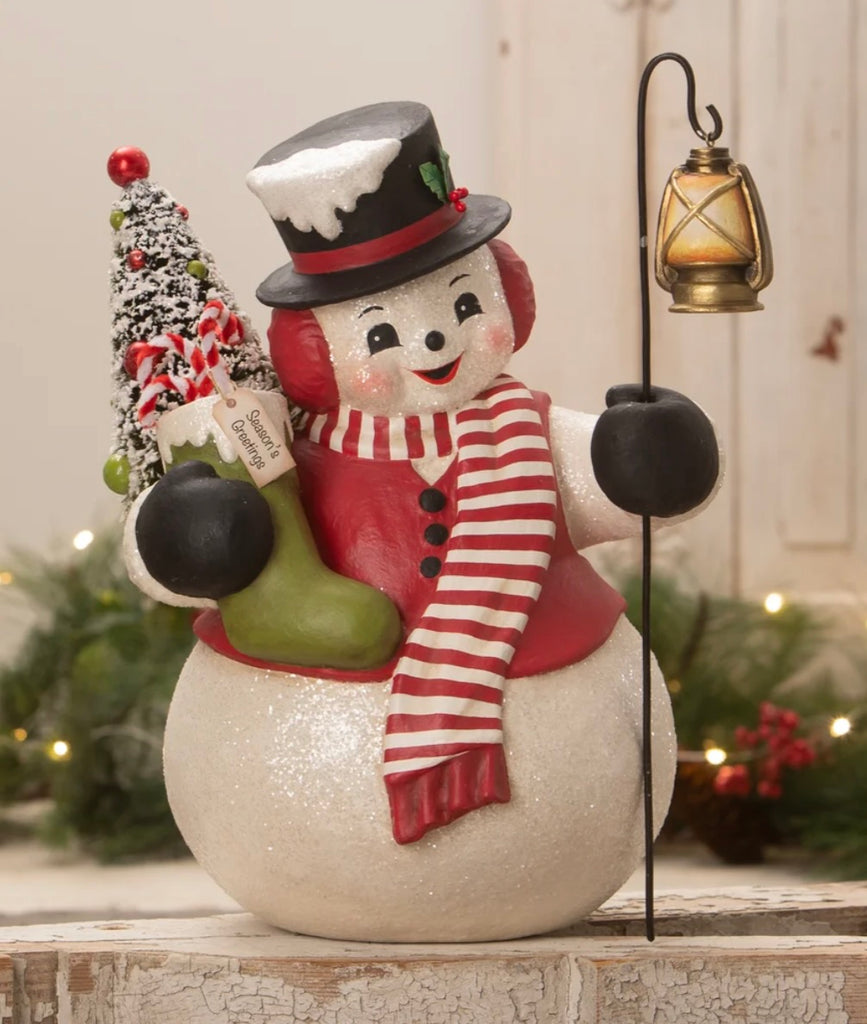 Snowman Stanley is sharing Christmas cheer everywhere he goes this holiday season. This paper mache jolly snowman is wearing a festive black top hat adorned with snow and lacquer holly and berries, red vest and a red and white stripped scarf. He holds a green stocking with chenille candy canes and a white bottle brush tree. The white bottle brush tree is decorated with red and green beads covered with glitter. He also hold a lantern that hangs form a staff. Snowman Stanley will bring you holiday cheer for many years to come.